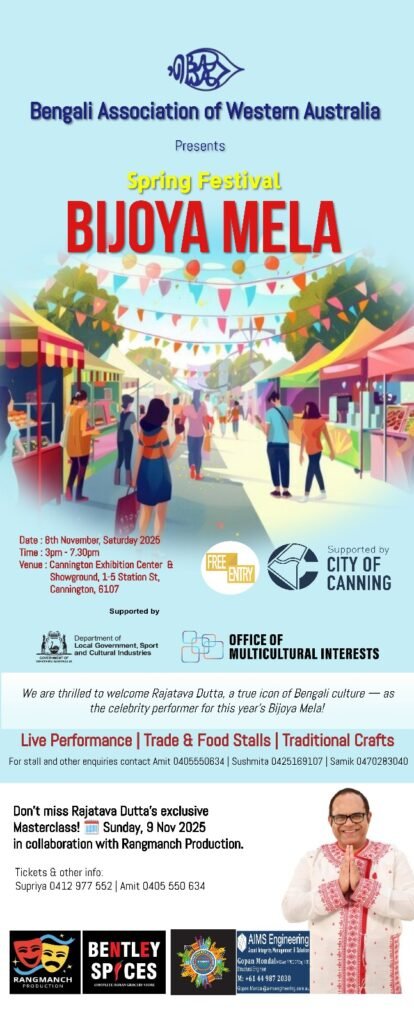 As the rhythmic beats of Durga Puja’s dhaak fade into memory and the gentle glow of Shyama Puja’s prodip dims, the vibrant essence of বাঙালিয়ানা awakens once more – calling us to reunite in celebration at our cherished annual festival, Bijoya Mela 2025.